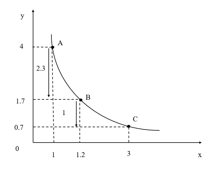 Ví dụ: Tại điểm A. Người tiêu dùng nhận được lợi ích là 4 đơn vị hàng y và 1 đơn vị hàng hóa x. Nếu người tiêu dùng muốn nhiều hàng hóa x hơn mà vẫn nhận được lợi ích như nhau ví dụ như điểm B, người tiêu dùng muốn 1.2 đơn vị hàng hóa x thì phải hy sinh 2.3 đơn vị hàng hóa y.